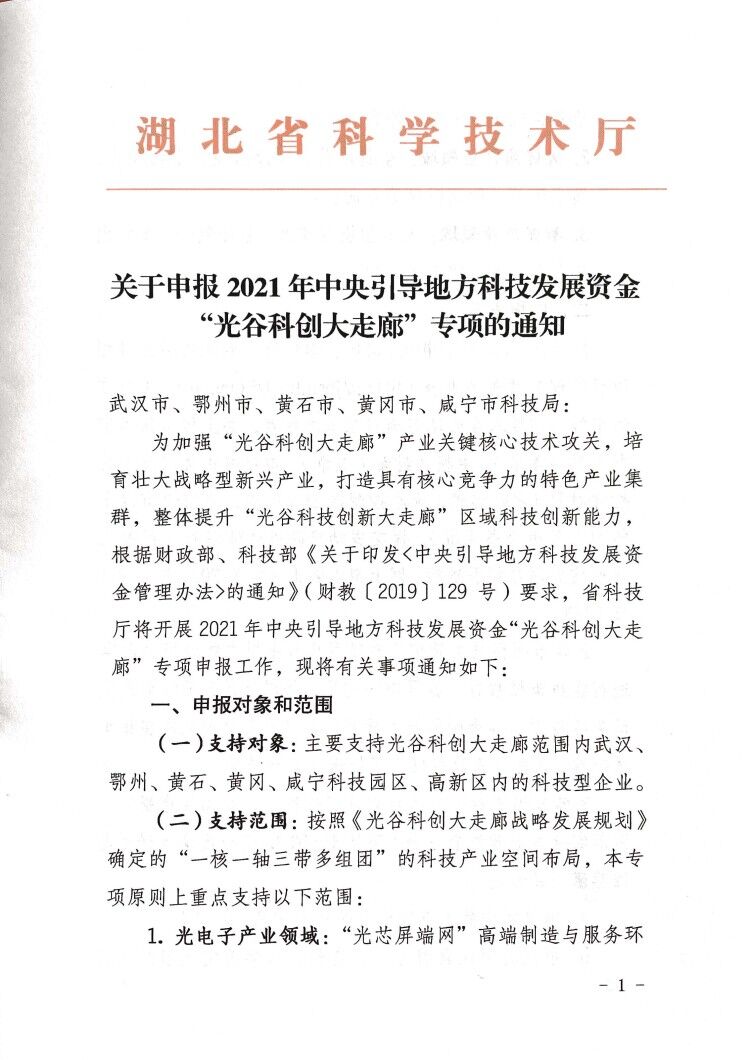 關(guān)于申報2021年中央引導(dǎo)地方科技發(fā)展資金“光谷科技創(chuàng)大走廊”專項的通知